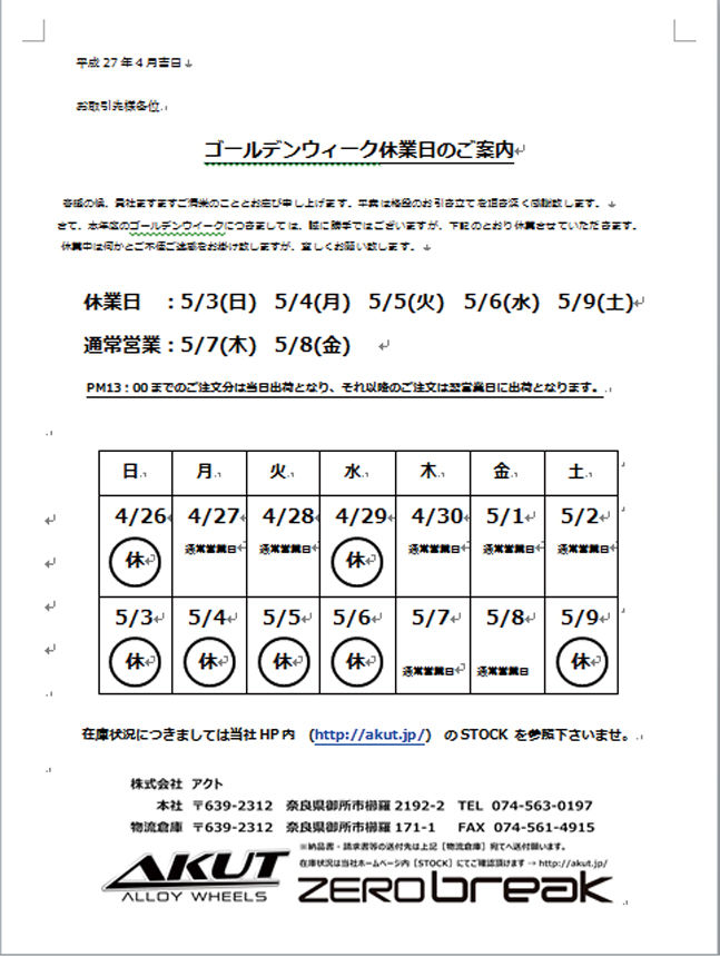 GW休業日のご案内